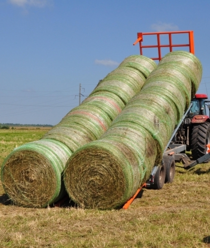Подбор рулонов корма (сена или соломы) непосредственно в поле.